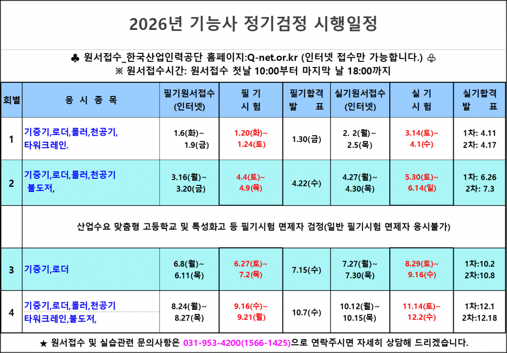 2026년 기능사 정기시험 일정(기중기, 로더, 롤더, 불도저, 천공기, 타워크레인) 페이지 정보 작성자 현대중장비운전전문학원 조회88회 작성일 25-12-26 09:47 본문 . 목록